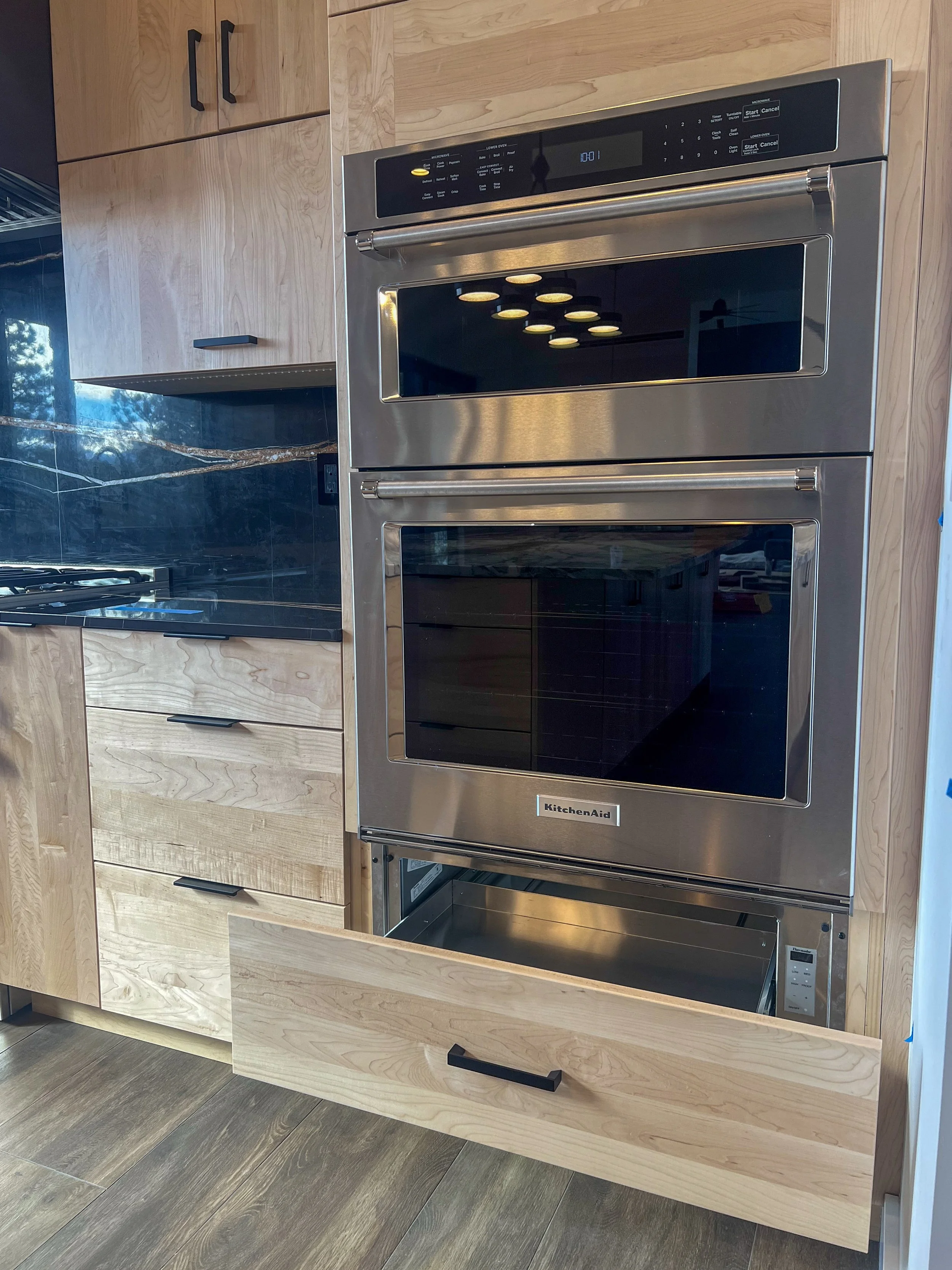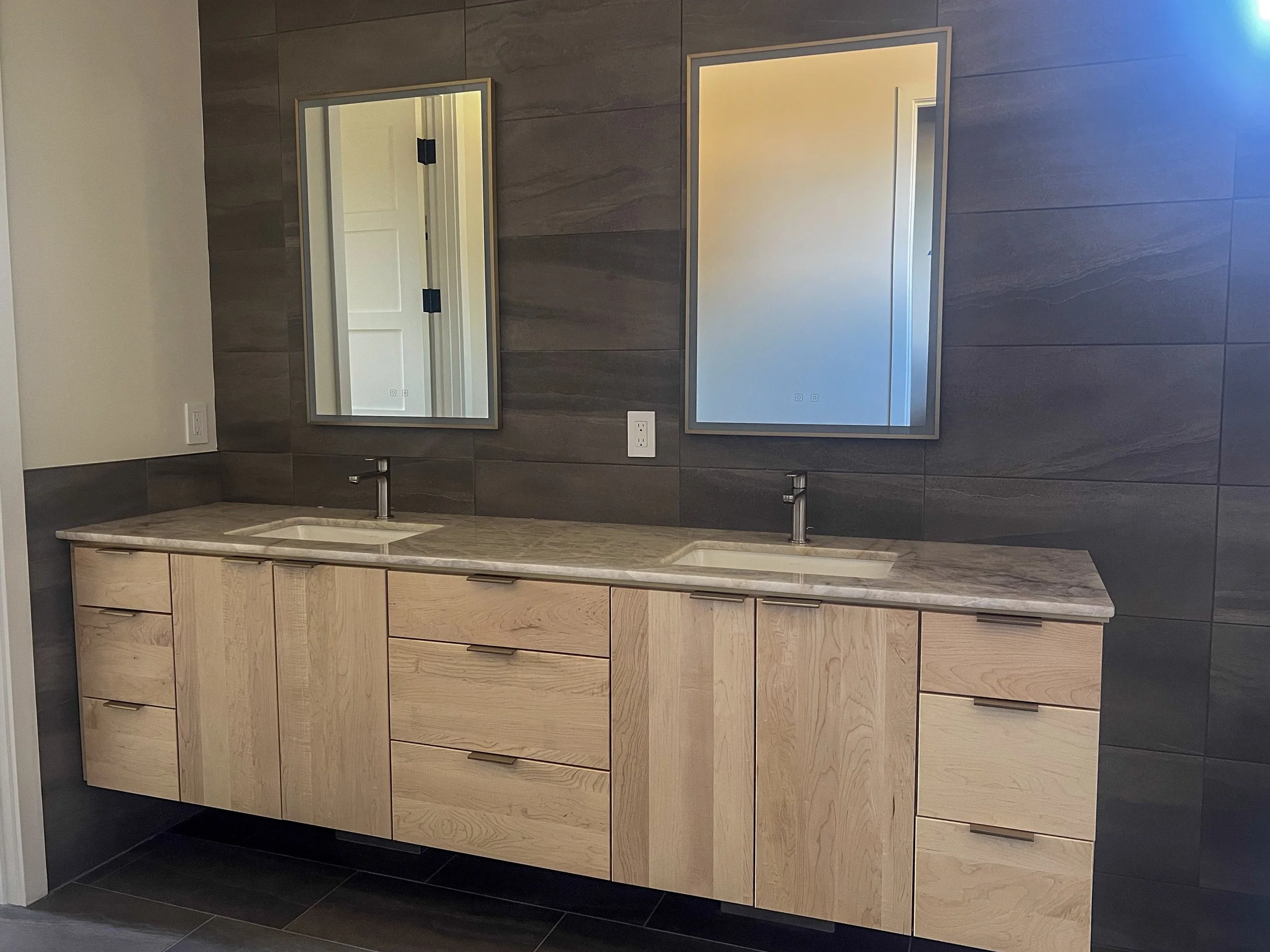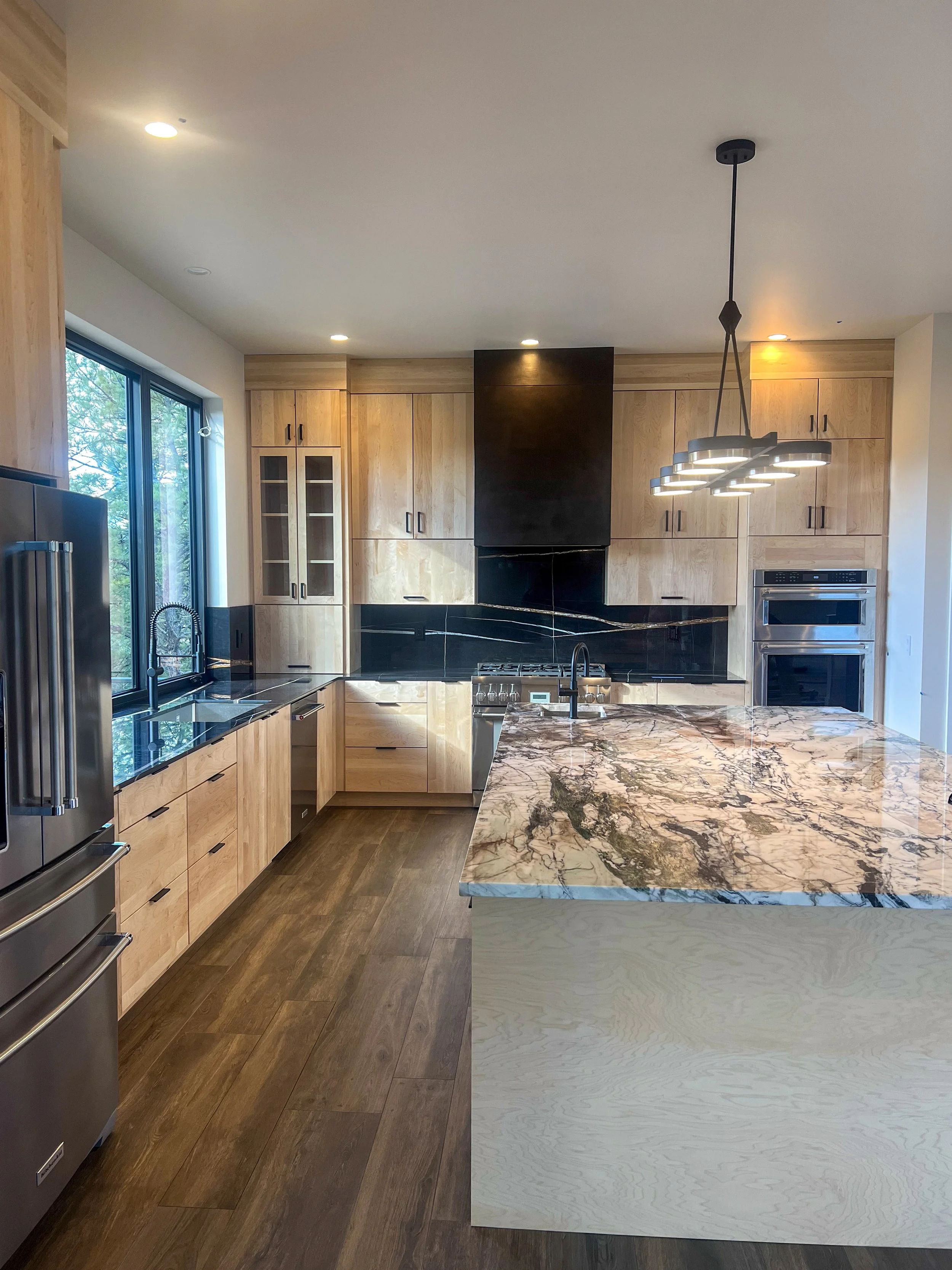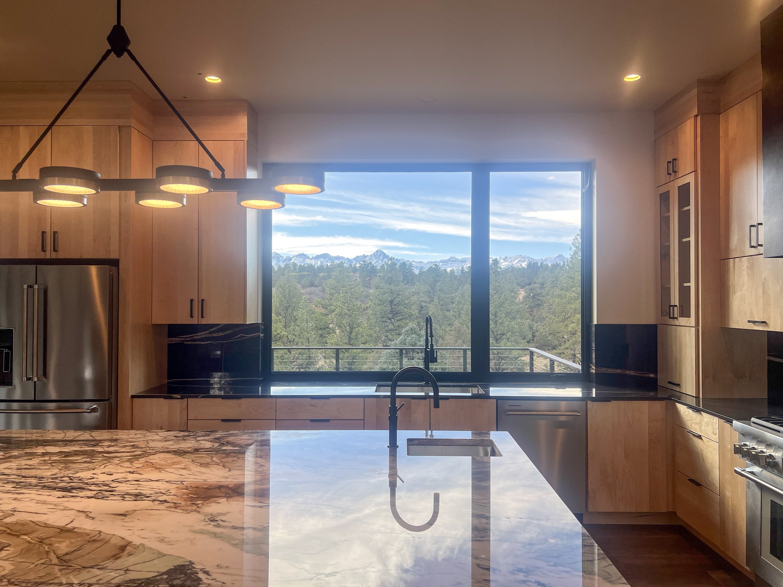 This modern mountain home takes a neutral color palate to new heights. This kitchen features floor to ceiling solid clear maple slab doors and natural Sahara noir marble counters and backsplash for a high contrast flare. To achieve a clean view to the mountains, the windows were placed at counter height for a lovely view from the island and the kitchen’s main sink. This functional space includes a countertop garage for hidden items, pull out utensil drawer, spice pull out drawer, a cabinet overlay warming drawer and vertical lift uppers for easy access to items while cooking. The bathrooms all feature floating vanities. The powder room has an integrated led light mat under the Cristallo quartzite counters.